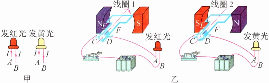 1. (2024·安徽一模)电动机在生活中的应用越来越广泛,某个 LED 灯发光的颜色与通过其电流方向的关系如图甲所示,图乙是两种不同安装方式的电动机,每个电动机的两个铜半环$E$和$F$与线圈两端相连,可随线圈一起转动,两半环中间断开,彼此绝缘;$C$和$D$是电刷,它们分别与两个半环接触,使电源和线圈组成闭合电路. 下列分析正确的是 ( )
