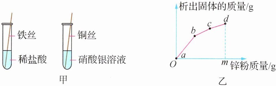(2)向硝酸铜、硝酸银和硝酸亚铁的混合溶液中连续、缓慢地加入 m g 锌粉,溶液中析出固体的质量与加入锌粉的质量关系如图乙所示。