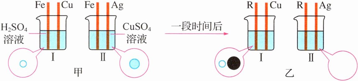 (2)为了探究 Fe、Cu、Ag、R(R 为未知金属)四种金属的活动性顺序,进行如下实验:如图甲所示,将四根金属丝同时插入盛有溶液的烧杯中,观察到Ⅰ中铁丝表面出现气泡,Ⅱ中铁丝表面有红色物质生成;如图乙所示,一段时间后,将烧杯中铁丝替换为 R 丝进行实验,观察到Ⅰ中 R 丝表面出现气泡,Ⅱ中 R 丝表面无明显现象。“○”“●”为相应金属丝插入烧杯前,烧杯中溶液内存在的阳离子。