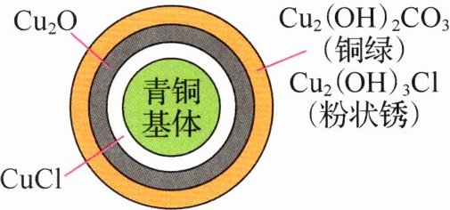 7.(2024·江苏常州模拟)走近千年文物,人们发现青铜器在含有$Cl^{-}$的环境中易生成$CuCl$,随着环境条件的变化而发生锈蚀,锈层物质成分示意图如右下图所示。下列说法错误的是 ( )