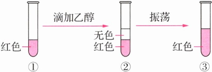 A 【解析】溶液是均一、稳定的混合物,液体①③的混合物均一、稳定,是溶液,液体②分层,不均一,不是溶液,故A错误;液体②中乙醇处于上层,水处于下层,说明乙醇的密度比水的小,故B正确;液体③全都变为红色,且不分层,该现象说明乙醇能溶解在水中,形成均一、稳定的混合物,故C正确;乙醇被水溶解,乙醇是溶质,乙醇是液态的,所以该实验说明溶液的溶质可以是液体,故D正确。