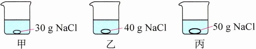 B 【解析】甲中能够溶解30 g氯化钠,溶质的质量分数为$\frac{30\ g}{100\ g + 30\ g}$×100%≈23.1%,乙和丙中溶解的氯化钠质量都是36 g,溶质的质量分数都是$\frac{36\ g}{100\ g + 36\ g}$×100%≈26.5%,因此充分溶解后三个烧杯内溶液中溶质的质量分数的大小关系为甲<乙 = 丙。故B正确。