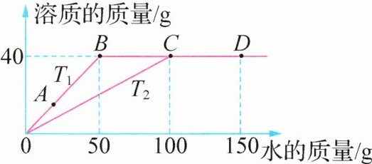 11. (2024·重庆模拟)分别在 T₁、T₂不同温度下,向 40 g KNO₃固体中不断加水,加入水的质量与溶质的质量关系如右下图所示,请回答下列问题。