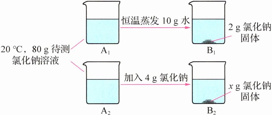 12. (2024·陕西节选)小明同学在测定某氯化钠溶液中溶质的质量分数时,用两只烧杯各取 80 g 待测溶液分别进行了如下实验。已知 20℃时,氯化钠的溶解度为 36 g。