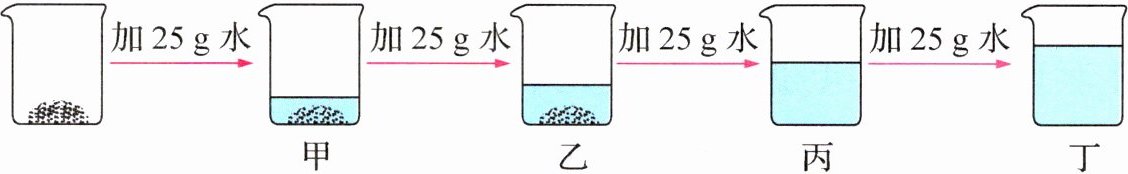 B 【解析】由题图可知,20 ℃时,烧杯甲中还有未溶解的硝酸钾固体,所以烧杯甲中硝酸钾溶液是饱和溶液,故A错误;由题图可知,20 ℃时,烧杯丙中没有未溶解的硝酸钾固体,所以烧杯丙中硝酸钾溶液可能是饱和溶液,也可能是不饱和溶液,在此基础上继续加水得到烧杯丁中溶液,溶剂增多,烧杯丁中硝酸钾溶液是不饱和溶液,故B正确;烧杯乙中是硝酸钾的饱和溶液,乙→丙过程中,硝酸钾溶液的溶质质量分数不变或减小,故C错误;丙→丁过程中,继续加入溶剂,溶质质量不变,所以硝酸钾溶液的溶质质量分数减小,故D错误。