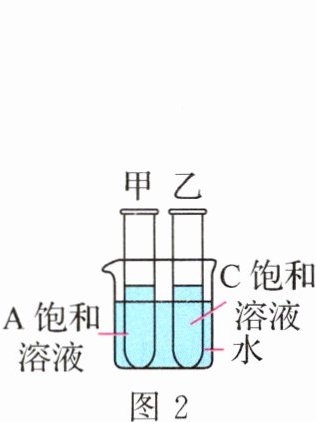 - D. $t_1\ ^{\circ}C$时,取等质量的$A$、$C$饱和溶液分别置于甲、乙两支试管中,如图$2$所示。在大烧杯中加入一定质量的氢氧化钠固体溶解后,$A$、$C$溶液的溶质质量分数的大小关系是$A = C$