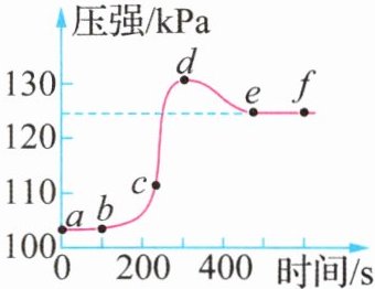 C 【解析】a→b段压强不变,是因为稀盐酸先与氧化铝反应生成氯化铝和水,铝基本未参加反应,故A正确;d→e段压强减小说明反应会放热,反应后温度降低,压强减小,故B正确;d点容器内气体压强不再增大,是化学反应的结束点,故C错误;c点时容器中溶液的溶质是过量的HCl、反应生成的AlCl₃,故D正确。
