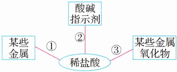 5. 新素养 科学思维 (2024·山东滨州改编)小海用右下图所示的思维导图总结了稀盐酸的化学性质,分析右下图并回答问题。
