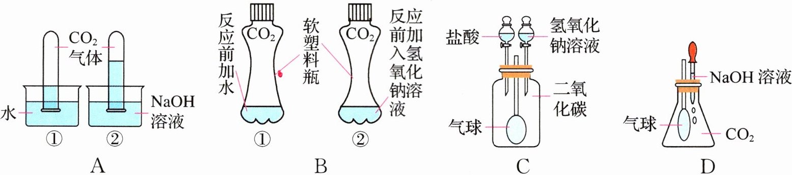 D 【解析】A项,②中液面上升比①中高,说明二氧化碳能与氢氧化钠反应,故A不符合题意;B项,②中塑料瓶变瘪比①中更明显,说明二氧化碳能与氢氧化钠反应,故B不符合题意;C项,气球先膨胀后缩小,是因为二氧化碳能够溶于水、能与氢氧化钠反应生成碳酸钠和水,碳酸钠又能与盐酸反应生成氯化钠、水和二氧化碳,故C不符合题意;D项,气球膨胀,可能是二氧化碳溶于水导致的,也可能是二氧化碳溶于水、与氢氧化钠反应共同导致的,该选项不能说明二氧化碳一定能与氢氧化钠反应,故D符合题意。