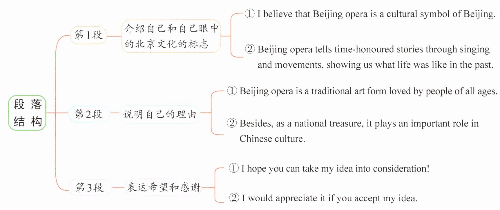 本题要求学生推荐一个自己眼中的北京文化的标志,对其作简要介绍,并说明推荐理由。本文讲述事实情况,应用一般现在时;在介绍标志时,应用第三人称;学生在说明自己的推荐理由时,应用第一人称。