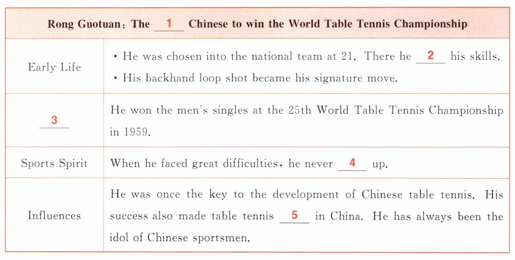 Rong showed great interest and talent in table tennis from a young age. At 21,he was chosen into the national team,where his skills were improved. His backhand loop shot became his signature(标志性的)move.