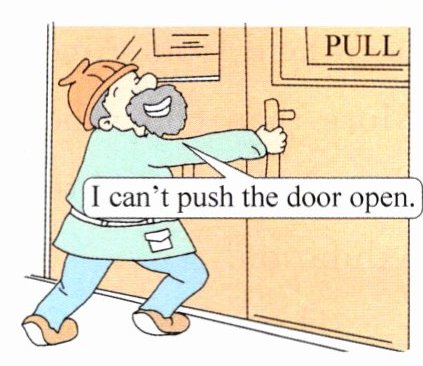 1. D 【解析】根据图片中的“I can't push the door open.”和“PULL”的标志可知,图中人物的开门方式是错的,他应该是去拉门而不是用力推门。