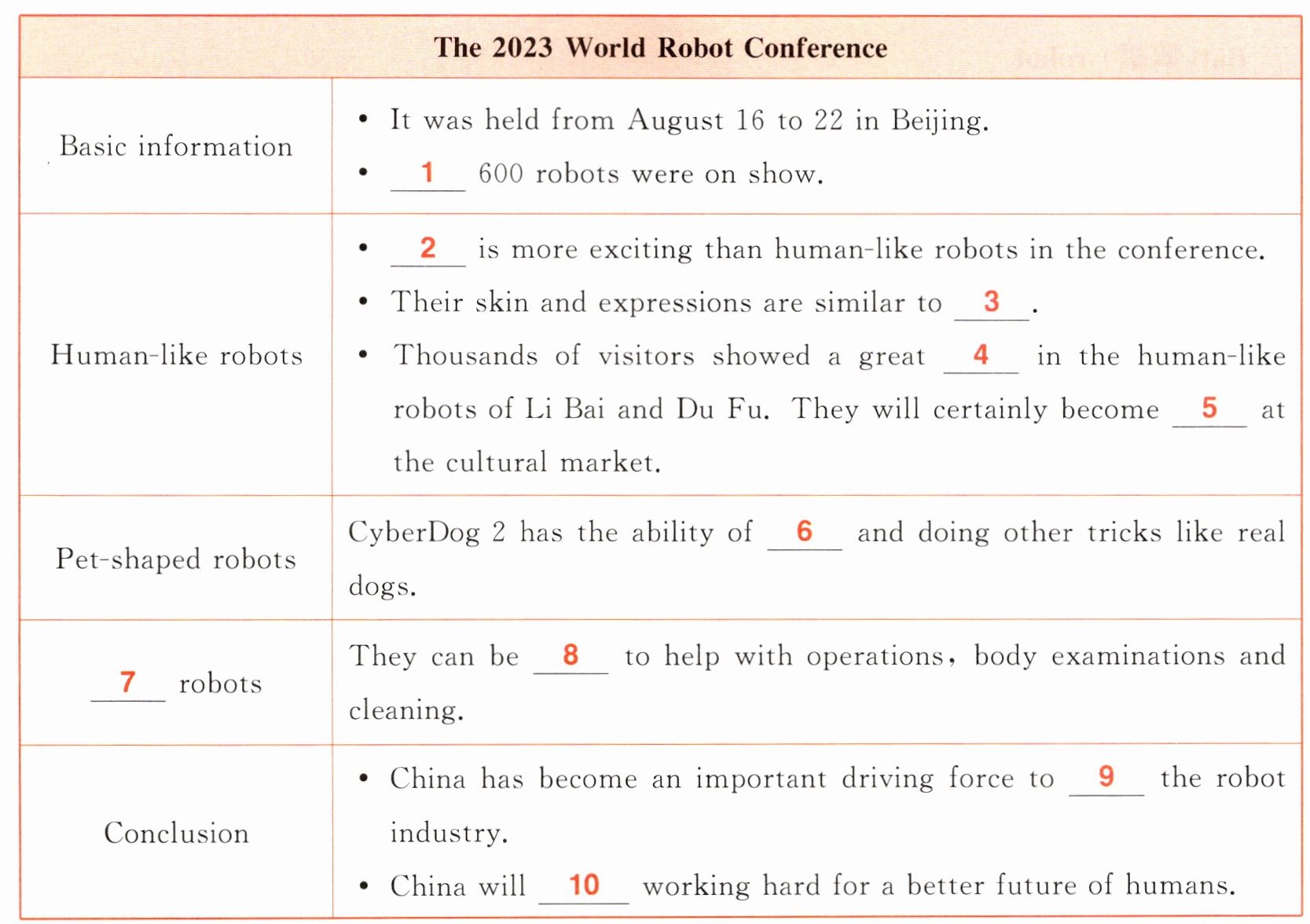 Human - like robots are the most exciting part of the conference. They have skin and expressions similar to those of humans. The human - like robots of Li Bai and Du Fu,China’s great poets from the Tang dynasty,sang their best - known works. And thousands of visitors were greatly interested in them. The makers are confident that such robots will gain popularity at the cultural market.
