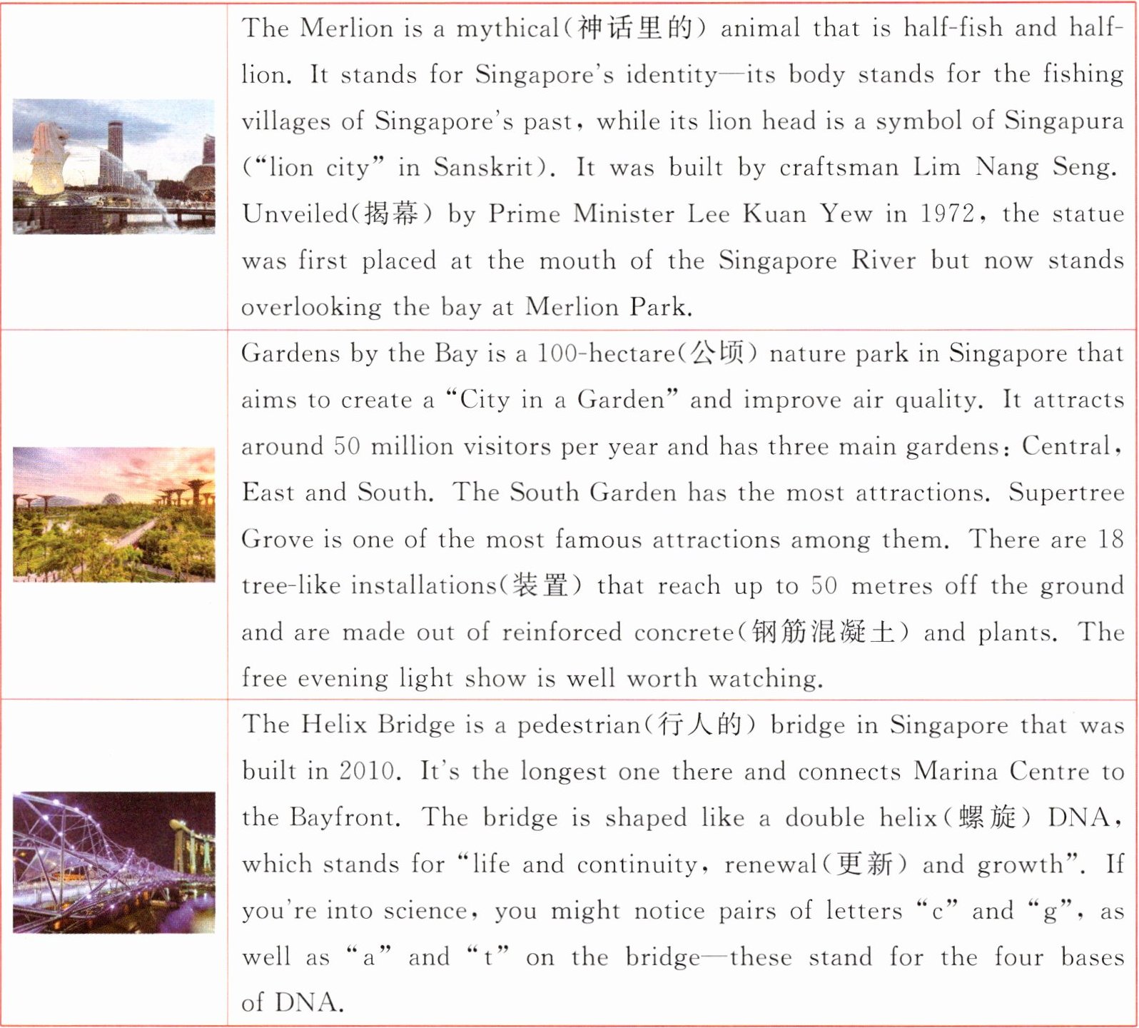 @@C 【解析】根据表格第二栏中“Gardens by the Bay is a 100 - hectare nature park in Singapore that aims to create a ‘City in a Garden’ and improve air quality.”可知,修建滨海湾花园是为了提高空气质量,即为了让环境变得更好。