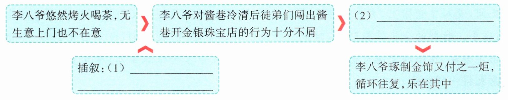 李八爷断然拒绝徒弟家旺要他去店里“坐堂”的邀请@@酱巷无酱却有名,家家户户都是金银匠,李八爷手艺最为精湛@@该句运用引用和排比的修辞手法,引用古诗词中“万点轻”“黄金缕”“泛流霞”等词,并三次强调“真个是”,富有气势,生动地展现了李八爷琢制的金饰之轻薄、精美,表现了李八爷琢制技艺的精湛,同时增添了文章的诗意和文采。@@(示例一)A句朗读设计:“手艺人”三个字读得一字一顿、铿锵有力,“这样”重读,整句话语调逐渐低沉,最后的语气词拖长音。设计理由:这样设计,更能体现李八爷对手艺人身份的极度看重,对徒弟及晚辈后生们为追逐利益而舍弃手艺行为的极度反对和沉痛,也更好地体现了李八爷对传统技艺的坚守与淡泊名利的品格。 (示例二)B句朗读设计:“手艺人”“不当”重读,整句话放缓语速,读得一字一顿,语气坚决。设计理由:这样设计,更能体现李八爷对手艺人身份的极度看重,认为手艺人就该坚守自己的技艺和初心,不为名利所驱使,也更能体现出李八爷对传统技艺的坚守与淡泊名利的品格。@@①徒弟家旺的顺应潮流与李八爷的淡泊坚守形成鲜明对比,更能突显李八爷对传统技艺的坚守与执着。②徒弟家旺的言辞反映了机器化大生产对传统手工艺行业的冲击,透露出当下民间手工艺日趋没落的无奈现状,更能引起读者的思考。@@示例一:选①。小说标题《琢磨》既指琢制金银饰品的过程和匠人的精湛手艺,又指时代洪流对手艺人精神的打磨和淬炼。小说中的手艺人李八爷,一生都在自己的手艺领域精耕细作、精益求精,即便手工金银饰品随着时代发展而逐渐被冷落,他也始终没有放弃自己的手艺,坚守着初心不为名利所诱。“择一事,终一生,把一件事做到极致,这就是匠心”这句话正是对像李八爷这样的手艺人精益求精、淡泊名利、纯粹坚守精神的高度概括。所以,我认为这句话更能概括小说的主题。