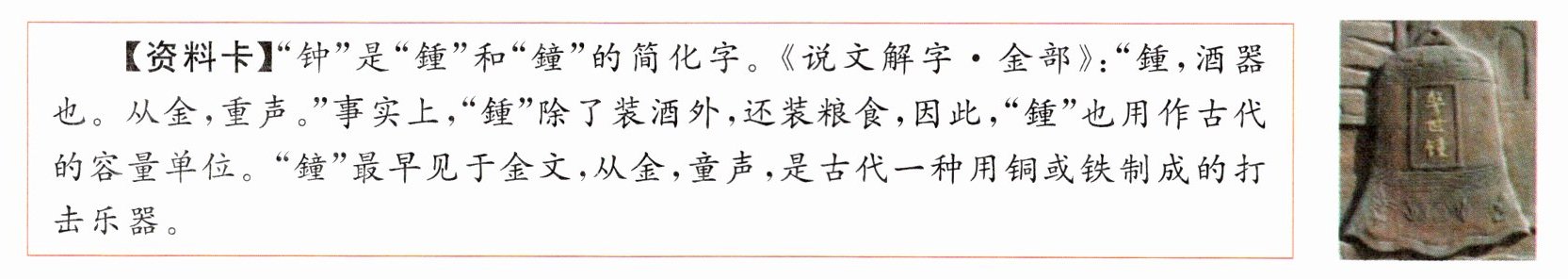 钟@@因为这里的“钟”是一种打击乐器,用以警示后人,所以写作“鐘”;而“鍾”指酒器或装粮食的器具,也用作容量单位。@@A【解析】(1)根据资料卡提示,“钟”是“鍾”和“鐘”的简化字,所以应填“钟”。(2)根据“那为什么用‘鐘’而不用‘鍾’呢”的提问可知,下句应向乙解释用“鐘”的原因。根据资料卡中“鍾”和“鐘”的释义,联系“警世钟”是一种用以警示后人的打击乐器来回答即可。(3)“万钟则不辩礼义而受之”中的“钟”是古代的一种量器,因此其繁体字应写作“鍾”。