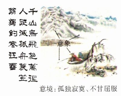 【材料二】如果说意象是一些砖石,那么意境就是一座完整的建筑。意境是诗人的主观情意和客观物象互相交融而形成的艺术境界,与意象构成包容与被包容的关系。这种意境不仅能包括诗里所有意象的审美指向,更能集中突出全诗的主旨。只有物象,或意象散乱,都不能构成一首有意境的诗。诗人要围绕诗的主旨将一组或多组意象有机组合,才能营造出意境。就像一幅画,多个意象围绕画的主题有机组合,构成的整体画面营造出的境界就是意境。如《江雪》图(见右图)。