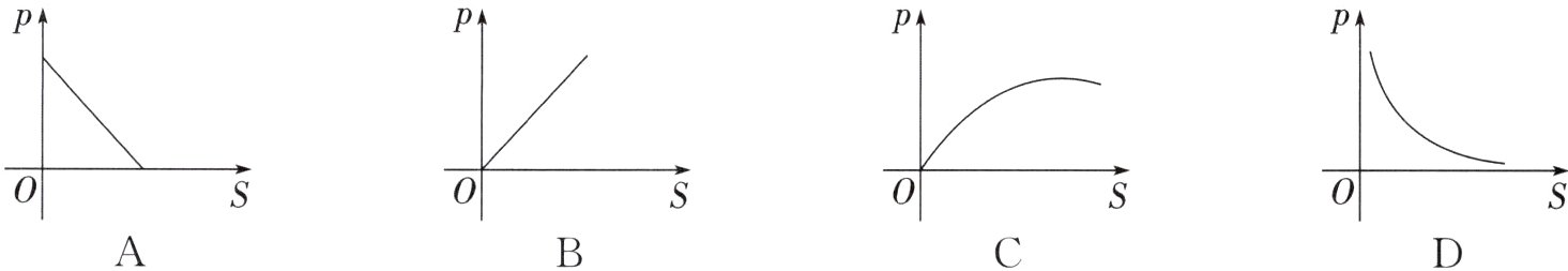 1.(2023·怀化)已知压力$F$(N)、压强$p$(Pa)与受力面积$S$(m²)之间有如下关系式:$F = pS$. 当$F$为定值时,能大致表示$p$与$S$之间函数关系的图像是 ( )