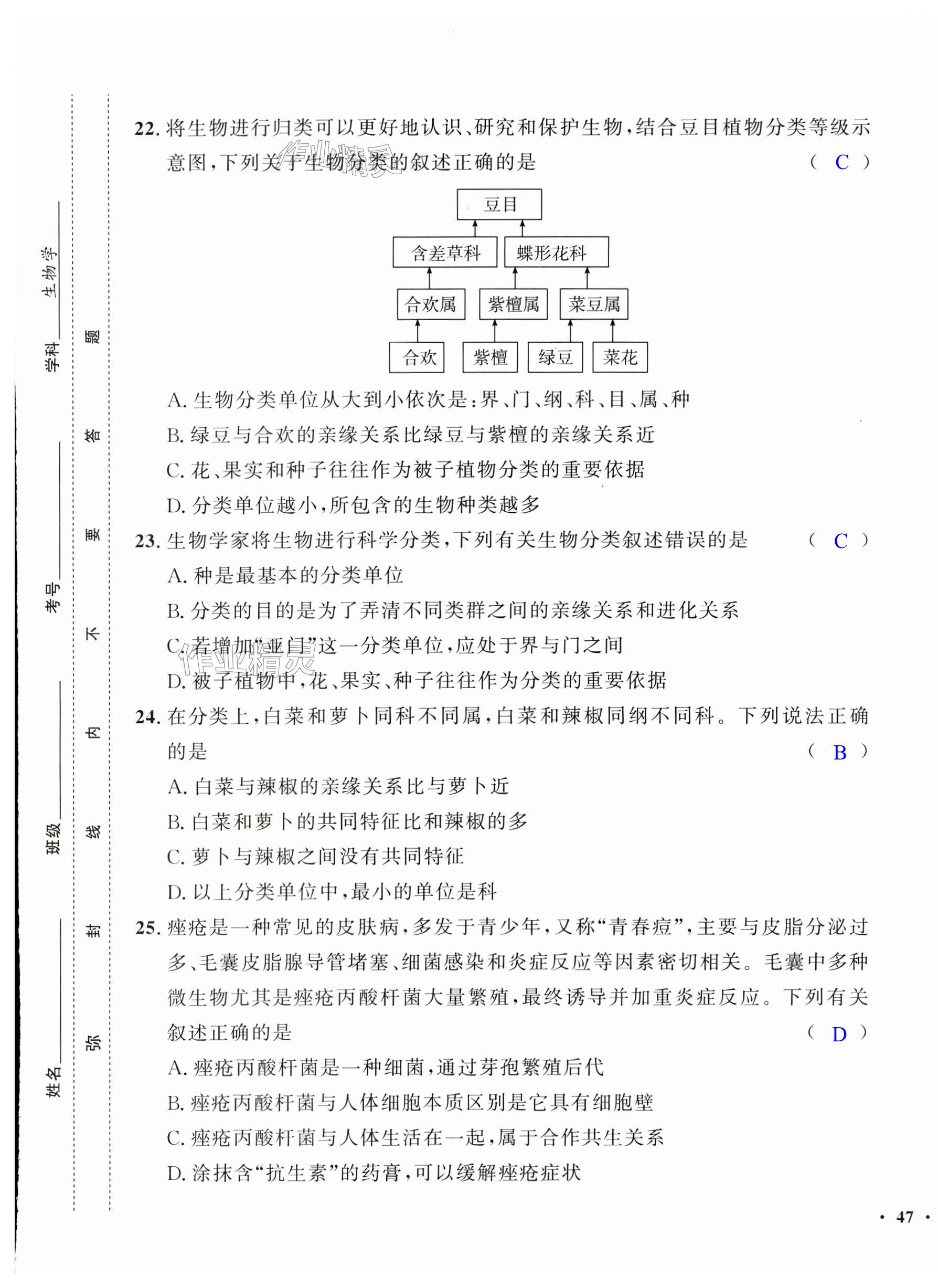 注:目前有些书本章节名称可能整理的还不是很完善,但都是按照顺序排列的,请同学们按照顺序仔细查找。练习册 2024年一课三练单元测试七年级生物上册济南版 答案主要是用来给同学们做完题方便对答案用的,请勿直接抄袭。