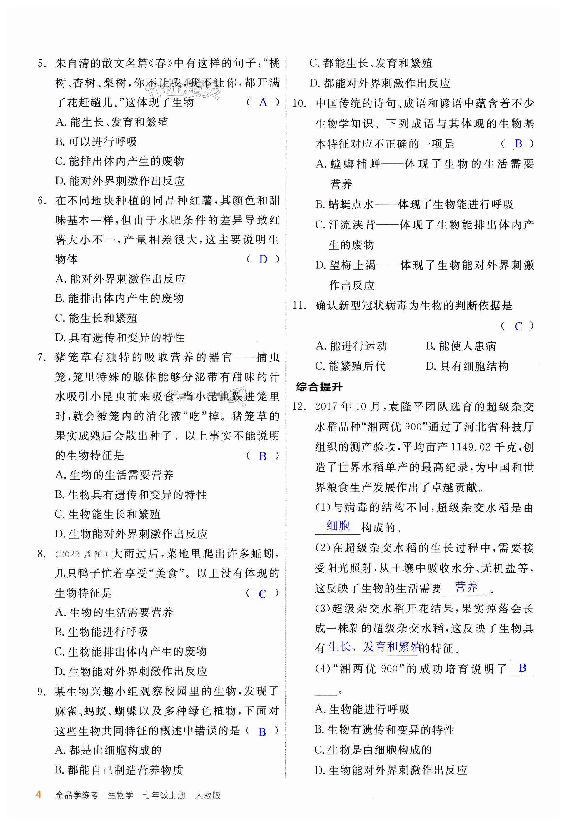 注:目前有些书本章节名称可能整理的还不是很完善,但都是按照顺序排列的,请同学们按照顺序仔细查找。练习册 2024年全品学练考七年级生物上册人教版陕西专版 答案主要是用来给同学们做完题方便对答案用的,请勿直接抄袭。