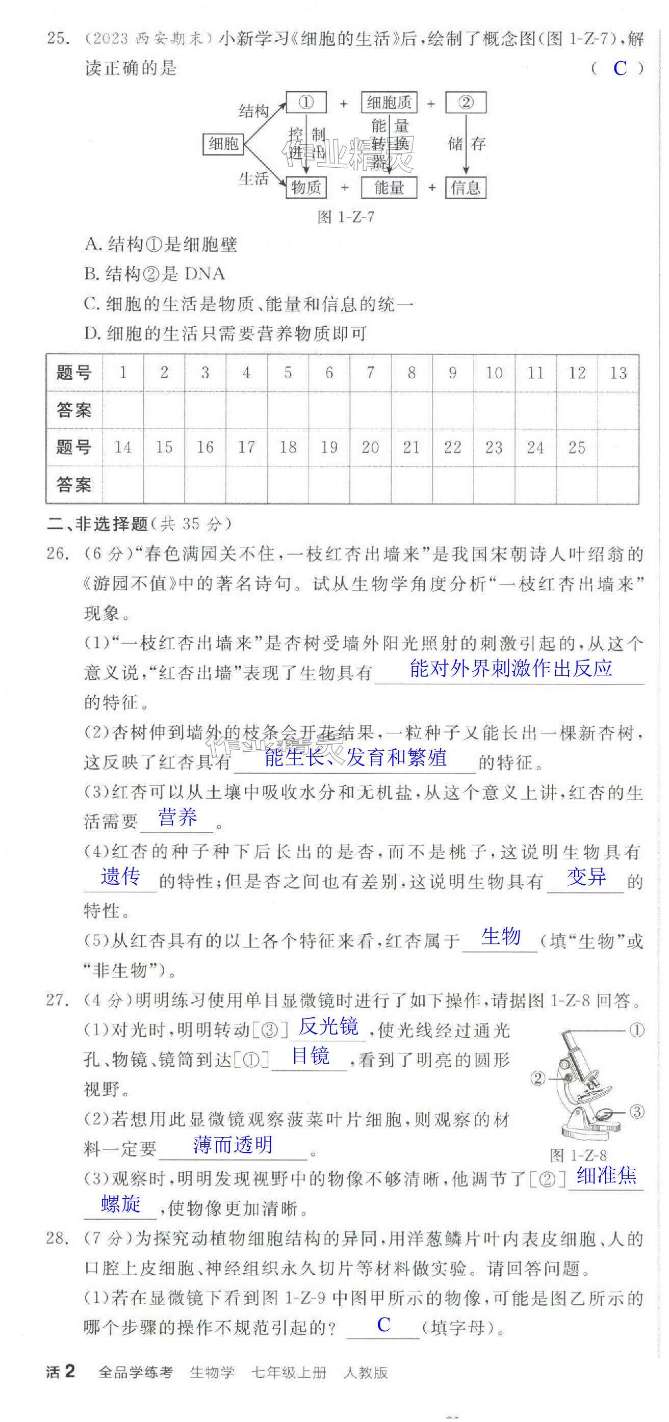 注:目前有些书本章节名称可能整理的还不是很完善,但都是按照顺序排列的,请同学们按照顺序仔细查找。练习册 2024年全品学练考七年级生物上册人教版陕西专版 答案主要是用来给同学们做完题方便对答案用的,请勿直接抄袭。
