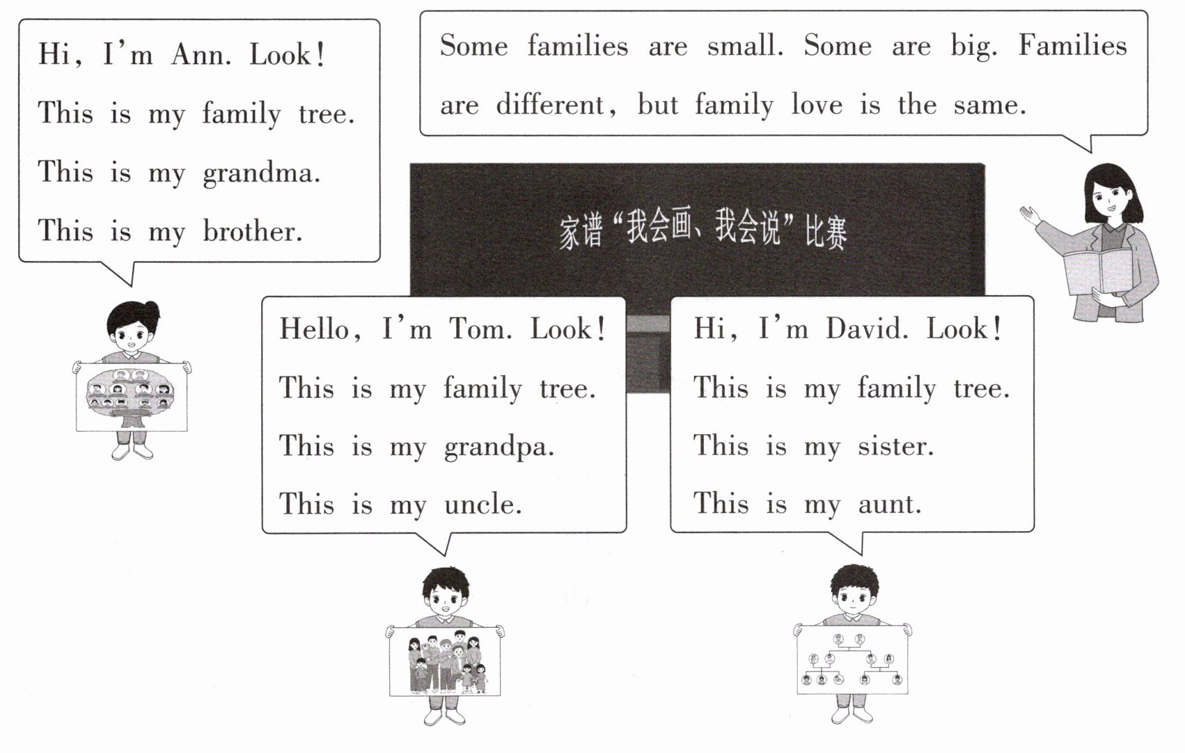 Ⅸ. 三年级(1)班的 3 名同学展示了不同的家谱图,并介绍了他们的家人。