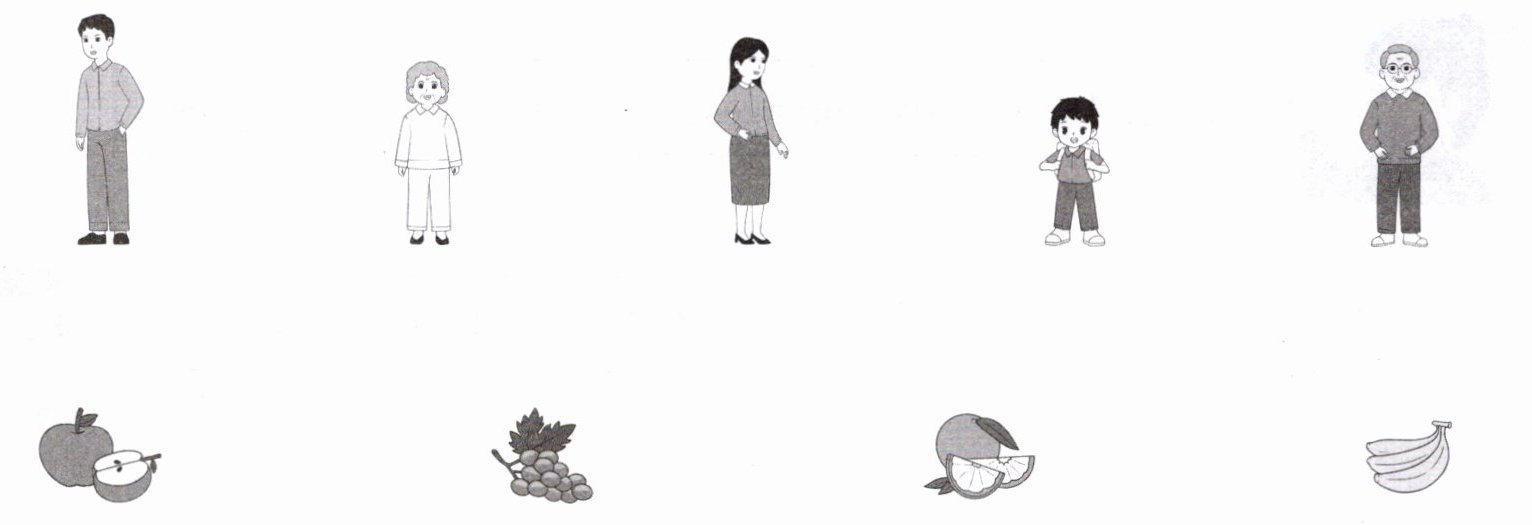 Ⅴ. Listen and match. (摘下水果后,来听听 Bob 描述他和他的家人都喜欢吃什么水果吧。听录音,连线。)