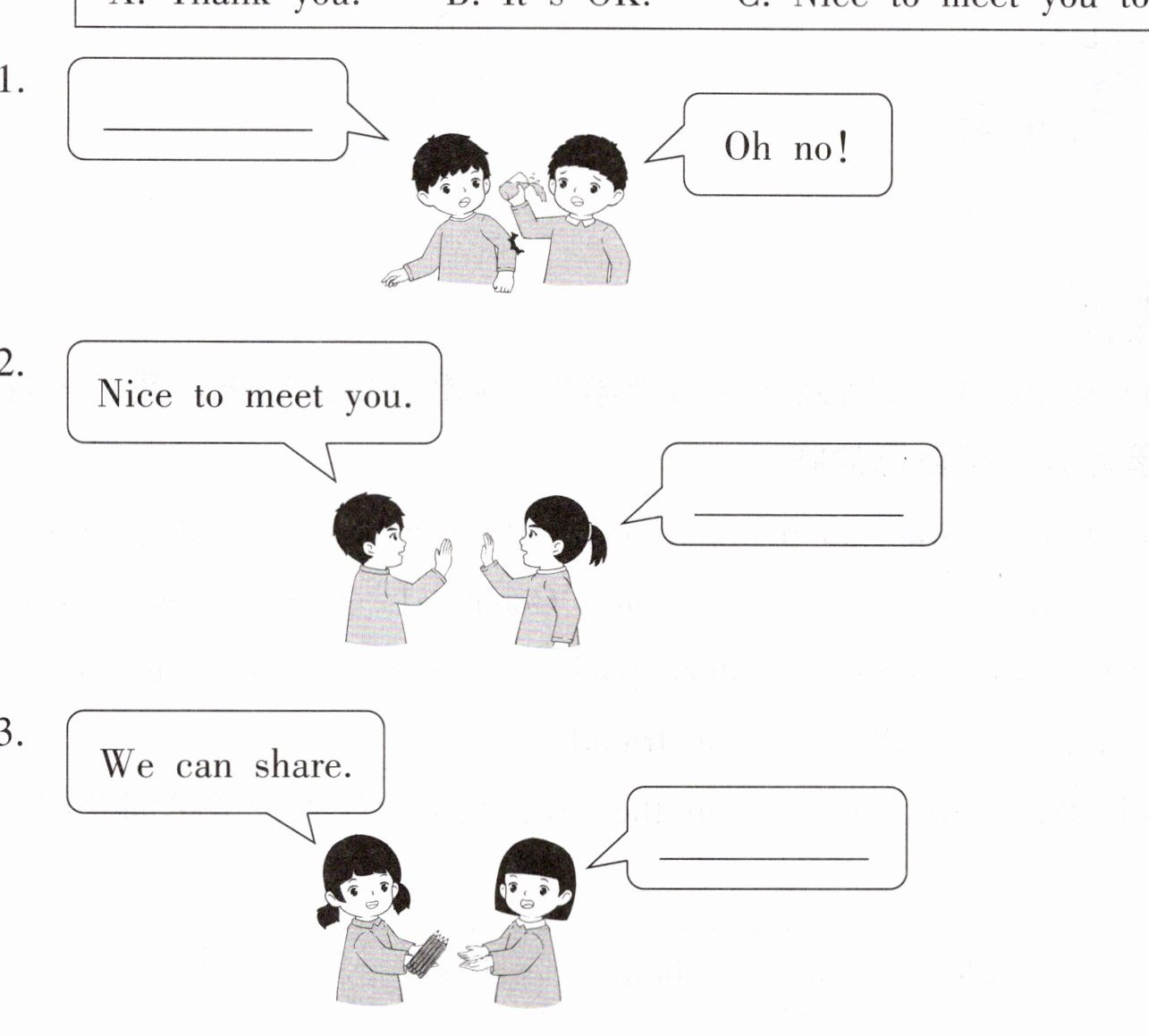 ( )2. 你的朋友不小心把水洒到了你书上,你朋友向你道歉,你该如何回应呢?