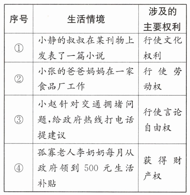A [解析]本题考查公民基本权利和义务。分析可知,小静的叔叔在某刊物上发表了一篇小说,涉及行使文化权利,①正确;小张的爸爸妈妈在一家食品厂工作,涉及行使劳动权,②正确;小赵针对交通拥堵问题,给政府热线打电话提建议,涉及行使建议权,③错误;孤寡老人李奶奶每月从政府领到500元生活补贴,涉及享有物质帮助权,④错误。