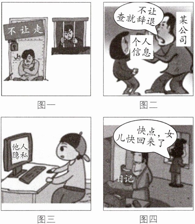 D [解析]本题考查公民权利。仔细观察漫画内容,“不让走”限制了他人的人身自由;对员工个人信息强制检查,侵犯了他人的隐私权;图三是不尊重他人隐私权的表现;图四中的父母没有尊重子女的隐私权,都体现了公民的人身自由受到了侵害,而人身自由包括人格尊严权,说明了公民行使权利有界限。B说法错误,D说法正确;A、C与题干的主旨内容不符,排除。