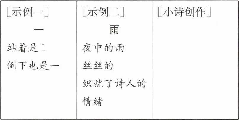 11 审美创造(2023·重庆中考A卷)参照示例,从下列备选汉字中任选一个为文化墙创作一首小诗。可从字形分析哲理,也可用意象表达情思,句式不限。