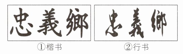 (1)跨学科 辨析书法字体 佛山作为中国古代四大名镇之一,有着非常悠久的历史,古时候佛山经历过一次成功的保卫战,因而有着“忠义乡”的美名。本次展示活动需要制作宣传佛山名城的短片,短片要从以下两幅字中选择一幅作为片头来体现“忠义乡”的特点。请你选择并结合字体特点来说明理由。