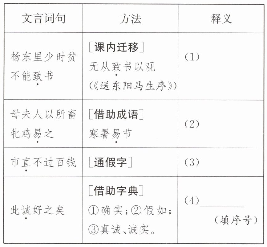得到 [解析](1)根据表中提供的方法“课内迁移:无从致书以观”可知,“致”在句中的意思是“得到”。句意:杨东里年轻时贫穷,不能得到书籍。