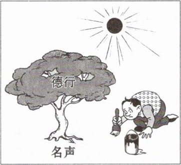 内容:画面中太阳下有一棵树,树冠上写着“德行”,树影上写着“名声”,树下一个人拿着刷子刷地,努力扩大树影的面积。寓意:德行如树,名声如影。只有德行高尚,名声才能响亮,做人若只想着扩大名声,不重视德行,是舍本逐末的行为。@@[示例一]给图画中的人物设计汗滴,凸显男子在扩大“名声”过程中的辛苦。