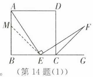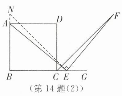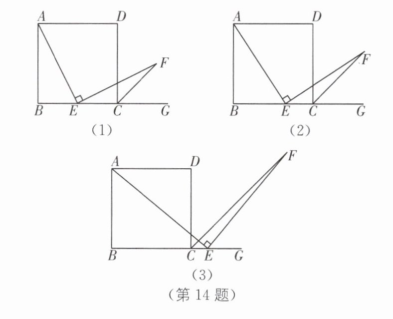 14 如图,四边形 ABCD 是正方形,E 是 BC 边所在直线上的点,∠AEF=90°,且 EF 交正方形外角∠DCG 的平分线 CF 于点 F.