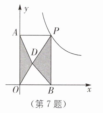 7 如图,点$P$是反比例函数$y = \frac{6}{x}$($x>0$)的图象上的任意一点,过点$P$分别作两坐标轴的垂线,与坐标轴构成矩形$OAPB$,点$D$是矩形$OAPB$内任意一点,连接$DA$,$DB$,$DP$,$DO$,则图中阴影部分的面积是( ).