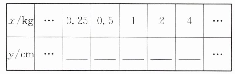 (2)调换秤砣与重物的位置,把秤砣挂在秤钩上,重物挂在支点$O$右侧的$B$处,使秤杆平衡,如图(2).设重物的质量为$x$ kg,$OB$的长为$y$ cm,写出$y$关于$x$的函数解析式,完成下表,画出该函数的图象.