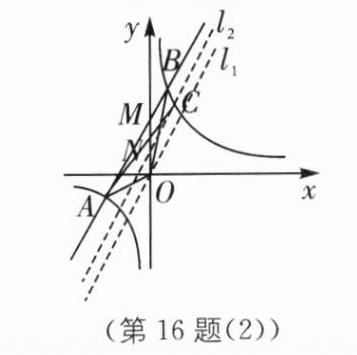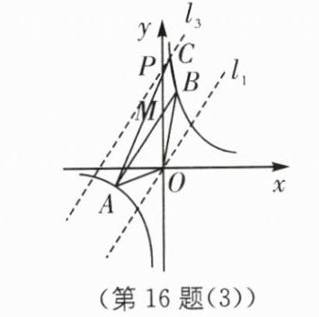 所以$S_{\triangle ABC}=\frac{1}{2}S_{\triangle AOB}$。因为$N$是$OM$的中点,所以$N(0,2)$。因为$l_2∥AB$,且经过点$N$,所以$l_2$的解析式为$y = 2x + 2$。联立$\begin{cases}y = 2x + 2\\y = \frac{6}{x}\end{cases}$,整理,得$x^2 + x - 3 = 0$,解得$x = \frac{-1-\sqrt{13}}{2}$或$x = \frac{-1+\sqrt{13}}{2}$。因为点$C$在第一象限,所以点$C$的横坐标为$\frac{-1+\sqrt{13}}{2}$;如图(3),在点$M$的上方取点$P$,使得$PM = \frac{1}{2}OM$,过点$O$作$l_1∥AB$,过点$P$作$l_3∥AB$与反比例函数在第一象限相交于点$C$,连接$AC$,$BC$,此时$l_3$到$AB$的距离是$l_1$到$AB$的距离的一半,即点$C$到$AB$的距离是点$O$到$AB$的距离的一半。
