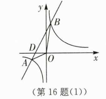 16. - (1)因为一次函数图象经过点$A(a,-2)$,所以$2a + 4 = -2$,解得$a = -3$,所以$A(-3,-2)$。因为$y = \frac{k}{x}$的图象经过点$A(-3,-2)$,所以$k = -3×(-2)=6$,故反比例函数的解析式为$y = \frac{6}{x}$。 - (2)联立$\begin{cases}y = 2x + 4\\y = \frac{6}{x}\end{cases}$,解得$\begin{cases}x = -3\\y = -2\end{cases}$或$\begin{cases}x = 1\\y = 6\end{cases}$,所以$B(1,6)$。设直线$y = 2x + 4$与$x$轴相交于点$D$,连接$OA$,$OB$,如图(1)。