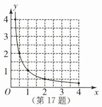 17. - (1)因为阻力×阻力臂 = 动力×动力臂,所以重物×$OA$ = 秤砣的质量×$OB$。因为$OA = 2cm$,重物的质量为$xkg$,$OB$的长为$ycm$,秤砣的质量为$0.5kg$,所以$2x = 0.5y$,所以$y = 4x$。因为$4 > 0$,所以$y$随$x$的增大而增大。因为当$y = 0$时,$x = 0$;当$y = 48$时,$x = 12$,所以$0 < x < 12$。 - (2)因为阻力×阻力臂 = 动力×动力臂,所以秤砣的质量×$OA$ = 重物的质量×$OB$。因为$OA = 2cm$,重物的质量为$xkg$,$OB$的长为$ycm$,秤砣的质量为$0.5kg$,所以$2×0.5 = xy$,所以$y = \frac{1}{x}$。当$x = 0.25$时,$y = \frac{1}{0.25}=4$;当$x = 0.5$时,$y = \frac{1}{0.5}=2$;当$x = 1$时,$y = 1$;当$x = 2$时,$y = \frac{1}{2}$;当$x = 4$时,$y = \frac{1}{4}$。作函数图象如图。