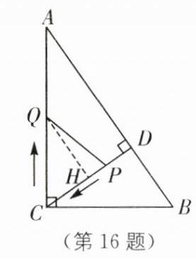 16 如图,在$Rt\triangle ABC$中,$\angle ACB = 90^{\circ}$,$AC = 8$,$BC = 6$,$CD\perp AB$于点$D$. 点$P$从点$D$出发,沿线段$DC$向点$C$运动,点$Q$从点$C$出发,沿线段$CA$向点$A$运动. 两点同时出发. 速度都为每秒1个单位长度,当点$P$运动到$C$时,两点都停止. 设运动时间为$t$秒.