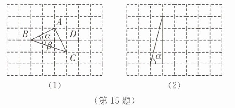 (1)小敏是这样解决问题的:如图(1),把$\alpha$,$\beta$放在正方形网格中,使得$\angle ABD=\alpha$,$\angle CBD=\beta$,且$BA$,$BC$在直线$BD$的两侧,连接$AC$,可证得$\triangle ABC$是等腰直角三角形,因此可求得$\alpha+\beta=\angle ABC =$_______.