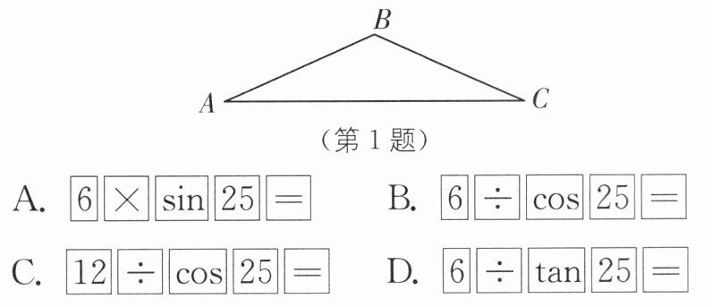 1.(2023·山东威海环翠区实验中学期末)如图,一座厂房屋顶人字架的跨度$AC = 12$ m,上弦$AB = BC$,$\angle BAC = 25^{\circ}$。若用科学计算器求上弦$AB$的长,则下列按键顺序正确的是( )。