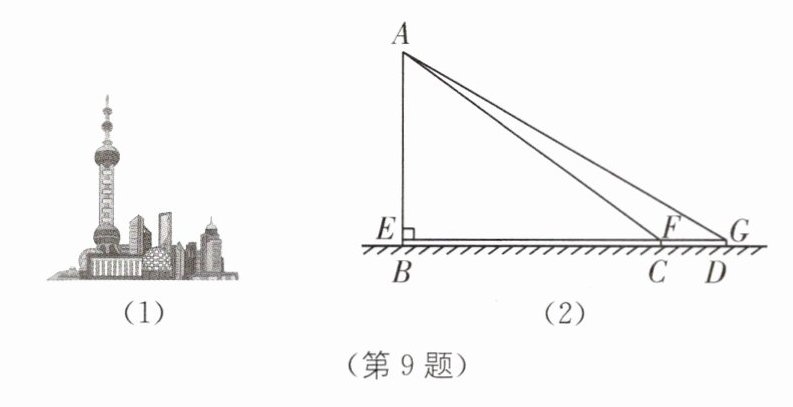 9 (2023·徐州中考)如图,为了测量电视塔高度,小明在云龙公园的点C处,用测角仪测得塔顶A的仰角∠AFE = 36°,他在平地上沿正对电视塔的方向后退至点D处,测得塔顶A的仰角∠AGE = 30°. 若测角仪距地面的高度FC = GD = 1.6 m,CD = 70 m,求电视塔的高度AB. (结果精确到0.1 m,参考数据:sin36°≈0.59,cos36°≈0.81,tan36°≈0.73,sin30° = 0.50,cos30°≈0.87,tan30°≈0.58)