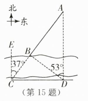 15. (2022·安徽中考)如图,为了测量河对岸A,B两点间的距离,数学兴趣小组在河岸南侧选定观测点C,测得A,B均在C的北偏东37°方向上,沿正东方向行走90米至观测点D,测得A在D的正北方向,B在D的北偏西53°方向上.求A,B两点间的距离.(参考数据:sin37°≈0.60,cos37°≈0.80,tan37°≈0.75)