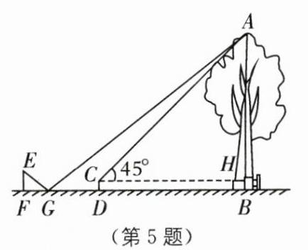 5 小明想利用刚学过的测量知识来测量学校内一棵古树的高度. 一天下午,他和学习小组的同学带着测量工具来到这棵古树前,由于有围栏保护,他们无法到达古树的底部B,如图所示. 于是他们先在古树周围的空地上选择一点D,并在点D处安装了测量器DC,测得古树的顶端A的仰角为45°;再在BD的延长线上确定一点G,使DG = 5米,并在G处的地面上水平放置了一个小平面镜,小明沿着BG方向移动,当移动到点F时,他刚好在小平面镜内看到这棵古树的顶端A的像,此时,测得FG = 2米,小明眼睛与地面的距离EF = 1.6米,测倾器的高度CD = 0.5米. 已知点F,G,D,B在同一水平直线上,且EF,CD,AB均垂直于FB,求这棵古树的高度AB. (小平面镜的大小忽略不计)