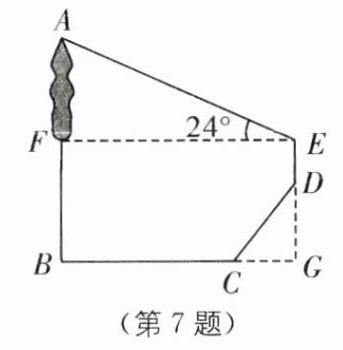 ∴DG = 6米,CG = 8米。 在矩形BGEF中,BG = EF = 15 + 8 = 23(米),BF = EG = 6 + 1.6 = 7.6(米), 在Rt△AEF中,∠AEF = 24°,