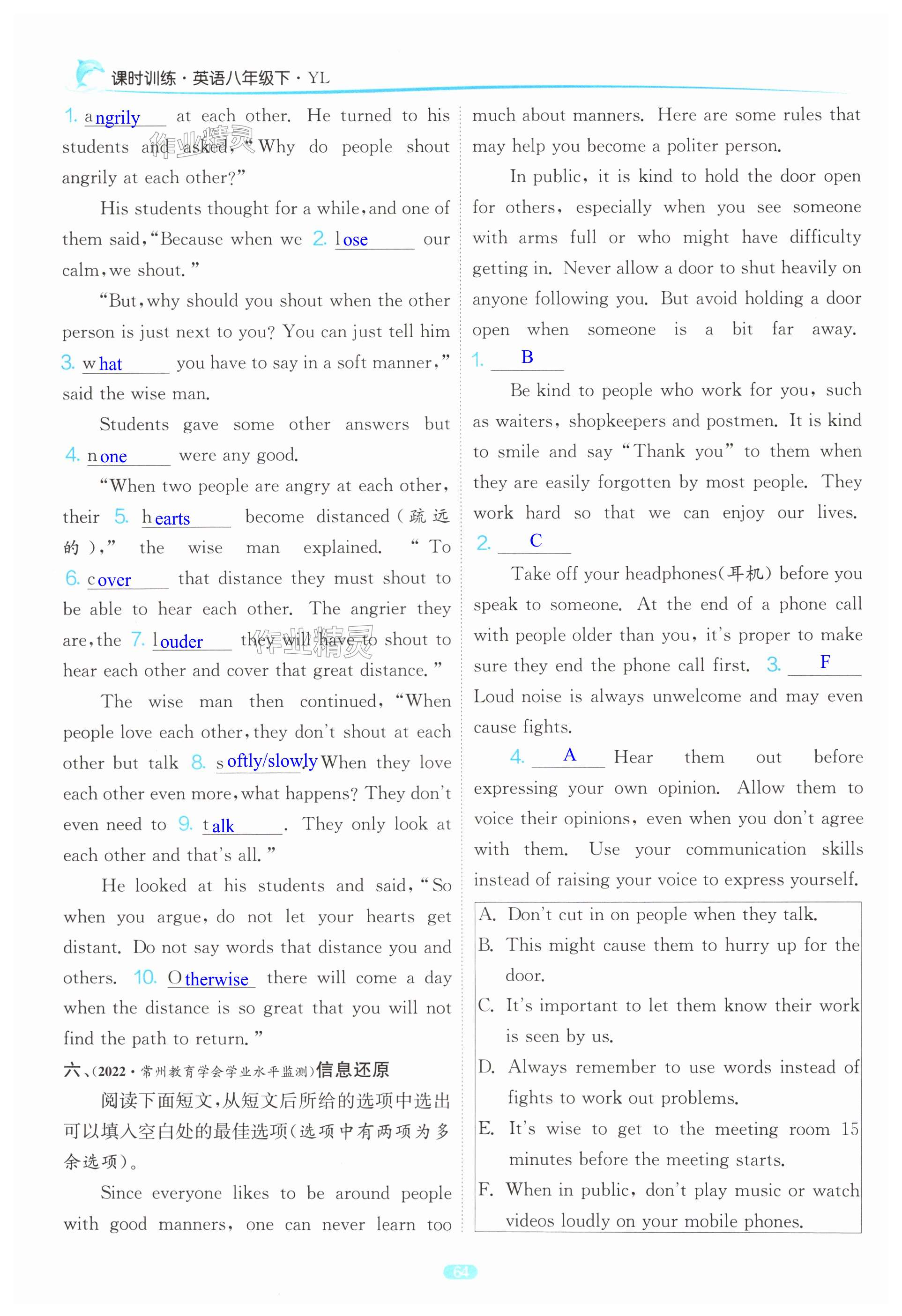 注:目前有些书本章节名称可能整理的还不是很完善,但都是按照顺序排列的,请同学们按照顺序仔细查找。练习册 2025年课时训练八年级英语下册译林版江苏人民出版社 答案主要是用来给同学们做完题方便对答案用的,请勿直接抄袭。
