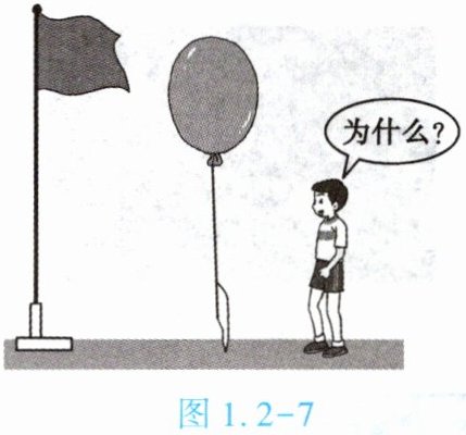 小明看到升旗时旗杆上的旗帜迎风飘扬,猜想:在气球下面系一面小旗,当气球升到空中以后,如果刮起了风,气球下面的小旗也会迎风飘扬。于是他动手做实验,将小旗固定在轻细的直杆上,然后把细杆系在气球下面,如图1.2 - 7所示。松手后气球带着细杆迎风飞舞,但小明发现细杆下的小旗仍然低垂,并没有飘起来。为什么呢?小明与其他同学仔细分析后,终于明白了其中的道理。你能说出其中的道理吗?