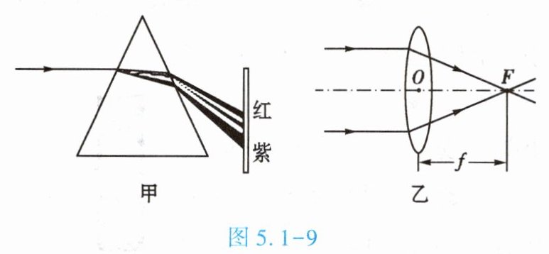 5. (★★★)如图5.1-9所示,冬冬在探究光的色散现象时,看到白光经三棱镜后,光屏上自上而下出现了红、橙、黄、绿、蓝、靛、紫的色带,冬冬对此现象产生的原因进行了思考。受此启发,在测量凸透镜的焦距时,冬冬想:如果分别用红光和紫光平行于同一个凸透镜的主光轴射入,红光、紫光对凸透镜的焦距是否不同呢?